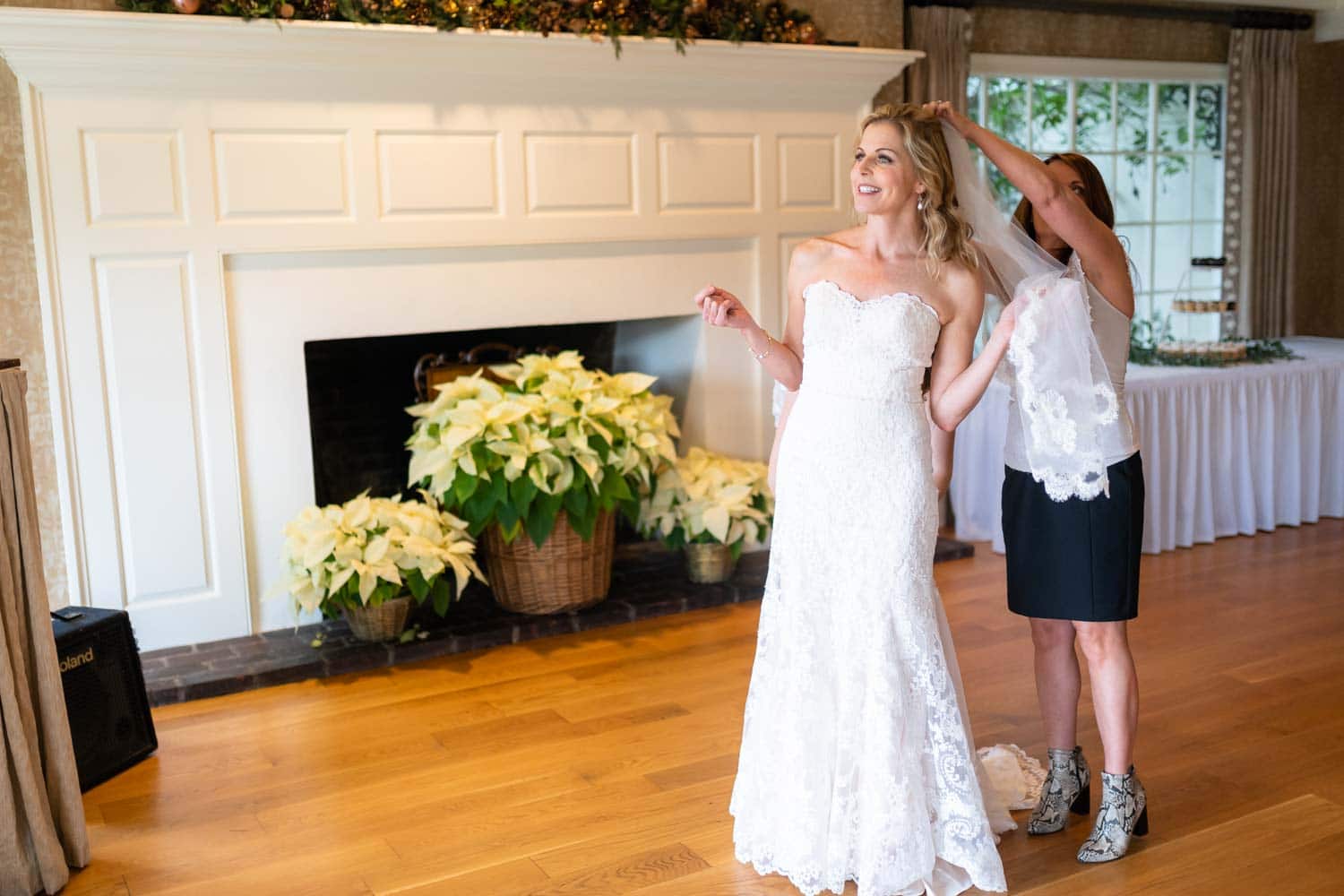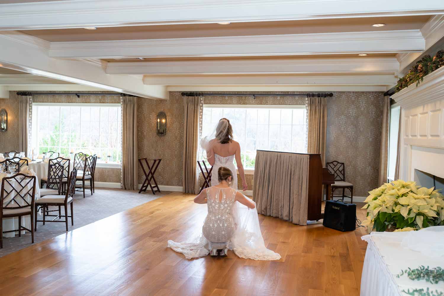 Tisha and Jay had a very small event, perhaps about 50 people, and they had the entire Inn all to themselves, which made it easy for their guests to fill the various rooms and keep the crowding to a minimum. There was a piano player there, doing some holiday music in the main bar area, and it blended in perfectly with the din of conversation among the guests. Wedding photography at The Kimberton Inn has some challenges. The main bar area is very dimly lit, but there is a ton of window light coming in at the perimeter of the bar. In this case, I chose to do some photos with no flash at all, and used just the window light, which created a sort of side light and lots of shadows. In other cases, I used the flash to bring up the ambient of the entire bar. I tended to like to the natural light photos quite a bit, as it was closer to the way things actually looked to the naked eye.